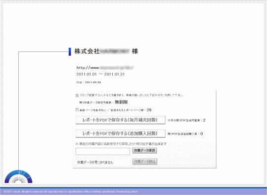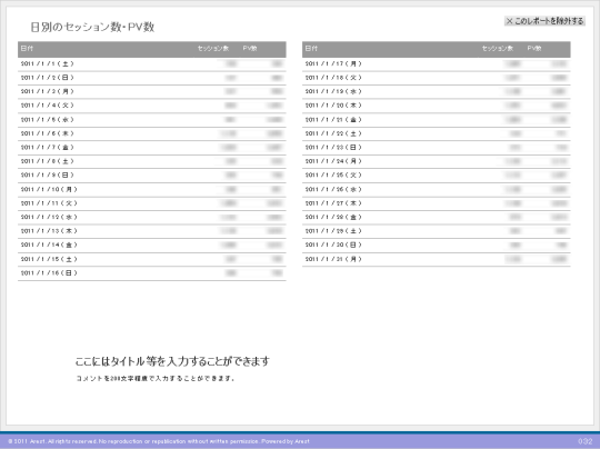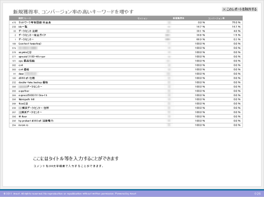 アレストは、この記事の執筆時点で32種類のレポートを作成してくれる(実際に表示されるレポートの数は、Google Analyticsでの目標設定の状態やアクセス状況によって異なる)。ここでは、そのなかから主要なレポートの例を紹介していこう(一部、実数やプライバシーにかかわる検索キーワードなどはマスクさせていただいており、見苦しい点はご容赦いただきたい)。