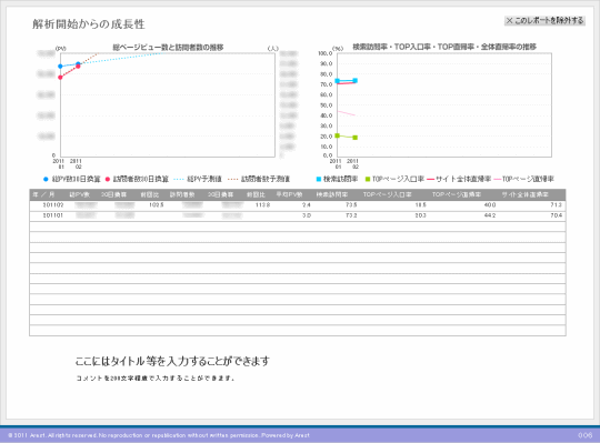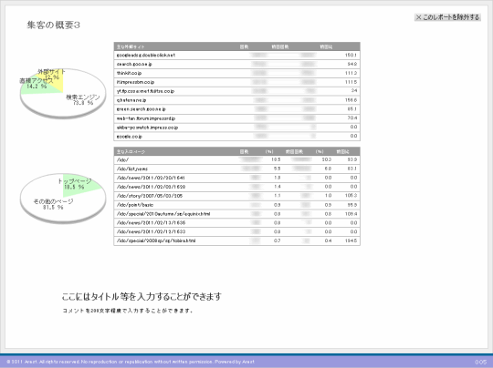 集客の概要レポート2 集客の概要をビジュアルにわかりやすく示したもの。レポート1の内容に加えて入り口ページ分析とトップページ分析が加わっている。
