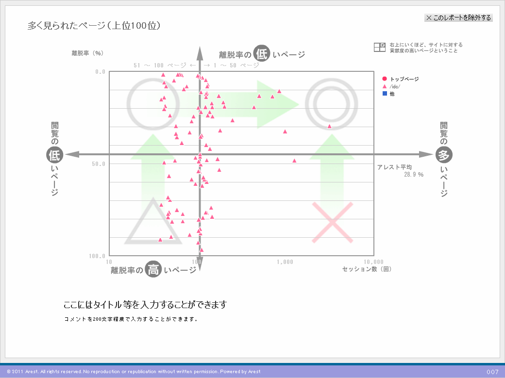 多く見られたページ(上位100位)レポート 上位100ページに関して、閲覧数を横軸に、離脱率を縦軸にとった4象限にプロットし、サイトへの貢献度の善し悪しを概観できるレポート。
