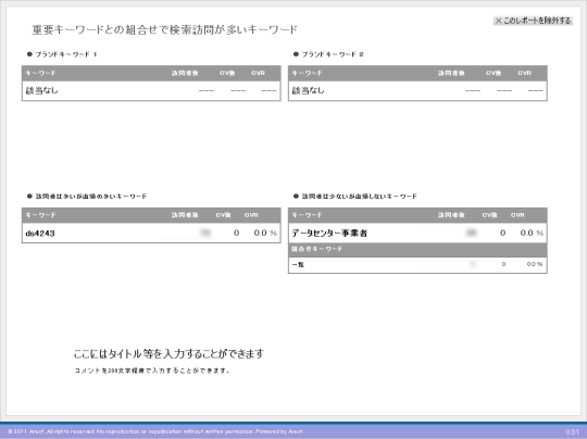 重要キーワードとの組合せで検索訪問が多いキーワードレポート アレストに登録した「ブランド名を表すキーワード」でのパフォーマンスや、その他、対応を検討するべき「重要キーワード」を表示してくれるレポート。