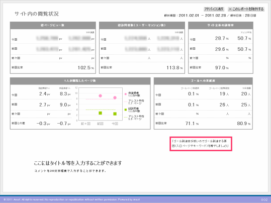 サイト内の閲覧状況レポート 基本的なアクセス指標をまとめて表示してくれるダッシュボード的なレポート。前月、前々月と比較してくれる。