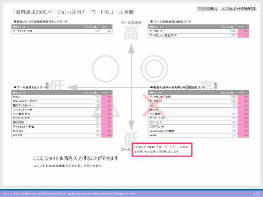 注目キーワードのゴール貢献レポート(目標設定ごと、全体) 検索エンジンからのアクセスで使われた検索キーワードごとに、集客力を横軸に、コンバージョンへの到達率を縦軸にとった4象限にプロットし、ゴールへの貢献度を示すレポート。目標設定ごとのレポートに加えて、「サイト全体でのゴール貢献」を軸にしたレポートも出してくれる。
