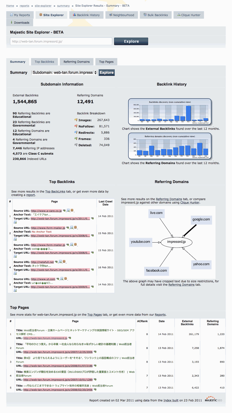 英語だけど使ってみたい (Majestic SEO Blog)被リンクチェック、つまり自分のサイトがどこからどんなリンクを受けているのかを調べるのに困っているWeb担当者も多いのではないだろうか。ヤフーが検索システムにグーグルを採用したことでlink:コマンドやサイトエクスプローラーが使えなくなり、英語圏向けのヤフーのYahoo! Site ExplorerやSEOmozのOpen Site Explorerで代用しているかもしれない。