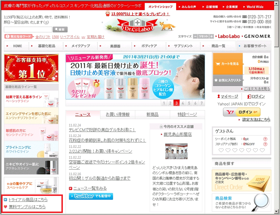 改めてトップページを見ると、初めての人向けのコンテンツがどこにあるのか見つけにくいことが分かる。図2左下(赤枠で囲んだ部分)に「トライアル商品はこちら」「無料サンプルはこちら」の2つのリンクが見えているが、どうやらこのあたりに初めての方向けのコンテンツがあるようだ。実際は、このテキストリンクと、その下の画像バナーとが、無料サンプルやトライアル(試用)商品を紹介しているエリアとなっている(図3)。