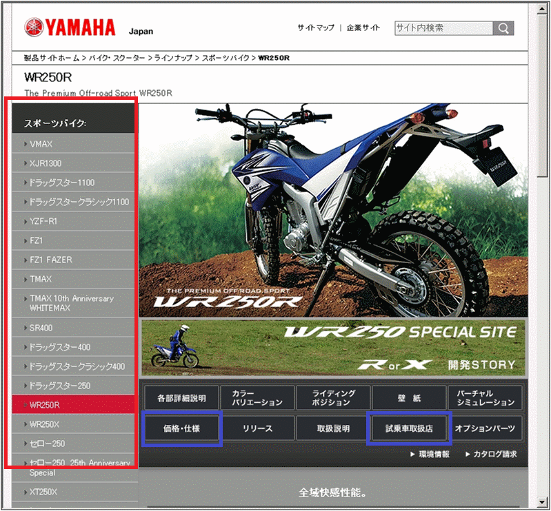 「昔乗っていた250CCのバイクを見て、試乗してみたくなった」という想定で、まず「WR250R」のページに行ってみる(図4)。