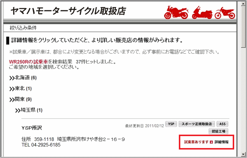 「試乗車取扱店」ページ以降はドメインが、それまでの「yamaha-motor.jp」から「yamaha-motorcycle-sales.jp」へと変わる。もちろん、アクセス解析で「yamaha-motor.jp」から「yamaha-motorcycle-sales.jp」への送客数はカウントしていると思われるが、図6の赤枠で囲った部分にある、「詳細情報」をクリックしたリンク先の詳細ページ(図7)には、せっかく取扱店のホームページのURLが記述されているのに、ハイパーリンクが施されていない。