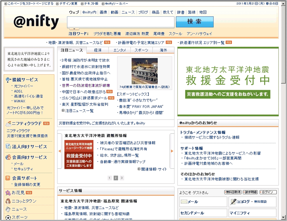 「@nifty」のトップページに話を戻そう。ページの構造を箇条書きにしてみると、下記のような特徴になっている。執筆時点(2011年3月中旬)は震災直後ということもあり、いつも表示されているコンテンツとは若干異なっている可能性はあるが、それはご了承いただきたい。