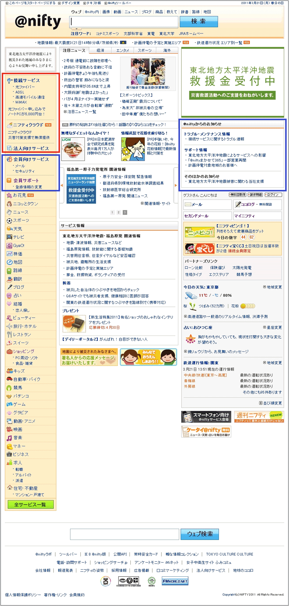 上段で私が感じた違和感を繰り返す。「@niftyに新規入会して欲しい人」「@nifty(ISP、ウェブ無料サービス)に入会している人」「一般利用者」という3つのユーザー層に対して、コンテンツ提示の仕方が、総花的であることだ。例えば3段組みの左側のエリアは全て黄土色で表示されているが、上部はISPサービスへの勧誘コンテンツで、下部は一般向けコンテンツで、特段の区別もなくつながっている。