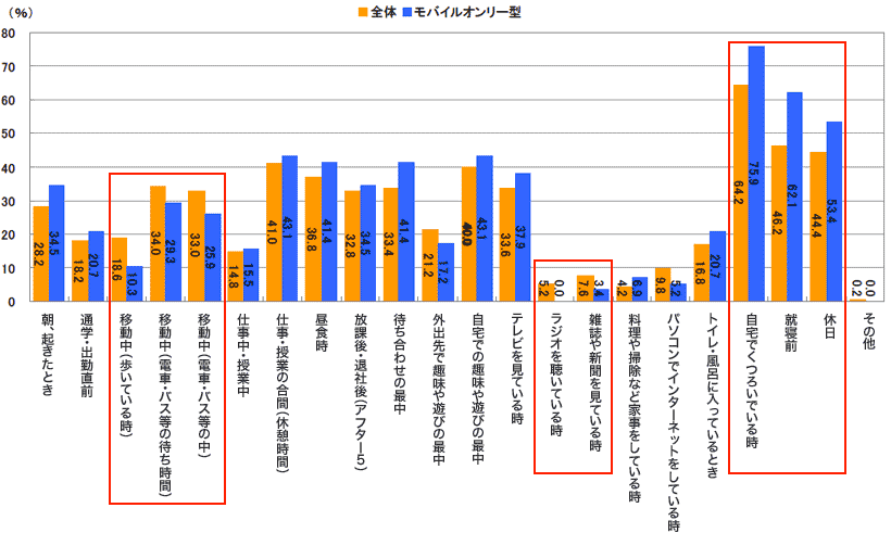 他のタイプに比べてモバイル利用が高いタイミングは、朝起きた時、就寝前、自宅でくつろいでいるとき、休日といった自宅でのプライベートな自由時間が挙げられます(図4)。モバイルがメインの接触メディアとなるこのタイプは、別メディアとの接触時の利用は他に比べて高くない結果となっています。また、移動中の接触が低い理由は、別の設問でこのタイプの通勤・通学の手段として自転車や自動車を長時間利用しているという結果からも想定できます。