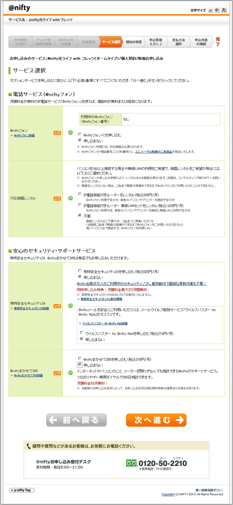 次の「サービス選択」ページ(図12)では、いくつかオプションがあるので、それを申し込むかどうかの選択が必要だ。全部で5つの項目、ラジオボタンから選択する。