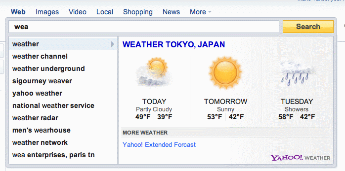 「wea」と入力すると「weather」(天気)を先読みし天気予報を見せてくれる。