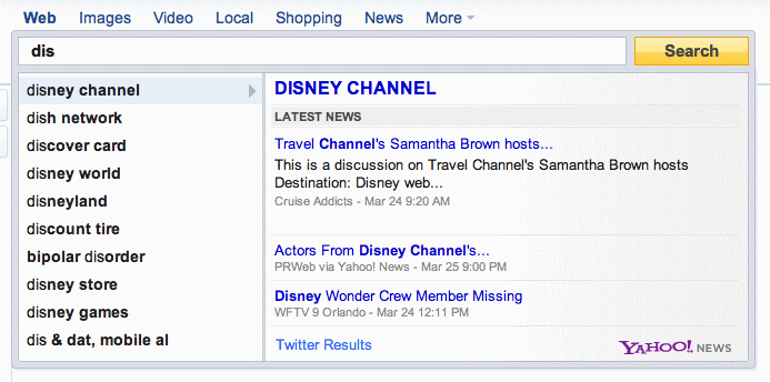 たとえば、検索ボックス「dis」と入力すると「disneyland」(ディズニーランド)や「 discount tire」(安売りタイヤ)といったキーワードを提示し、提示されたキーワードを選択するとその瞬間に関連情報(検索結果など)が表示される。