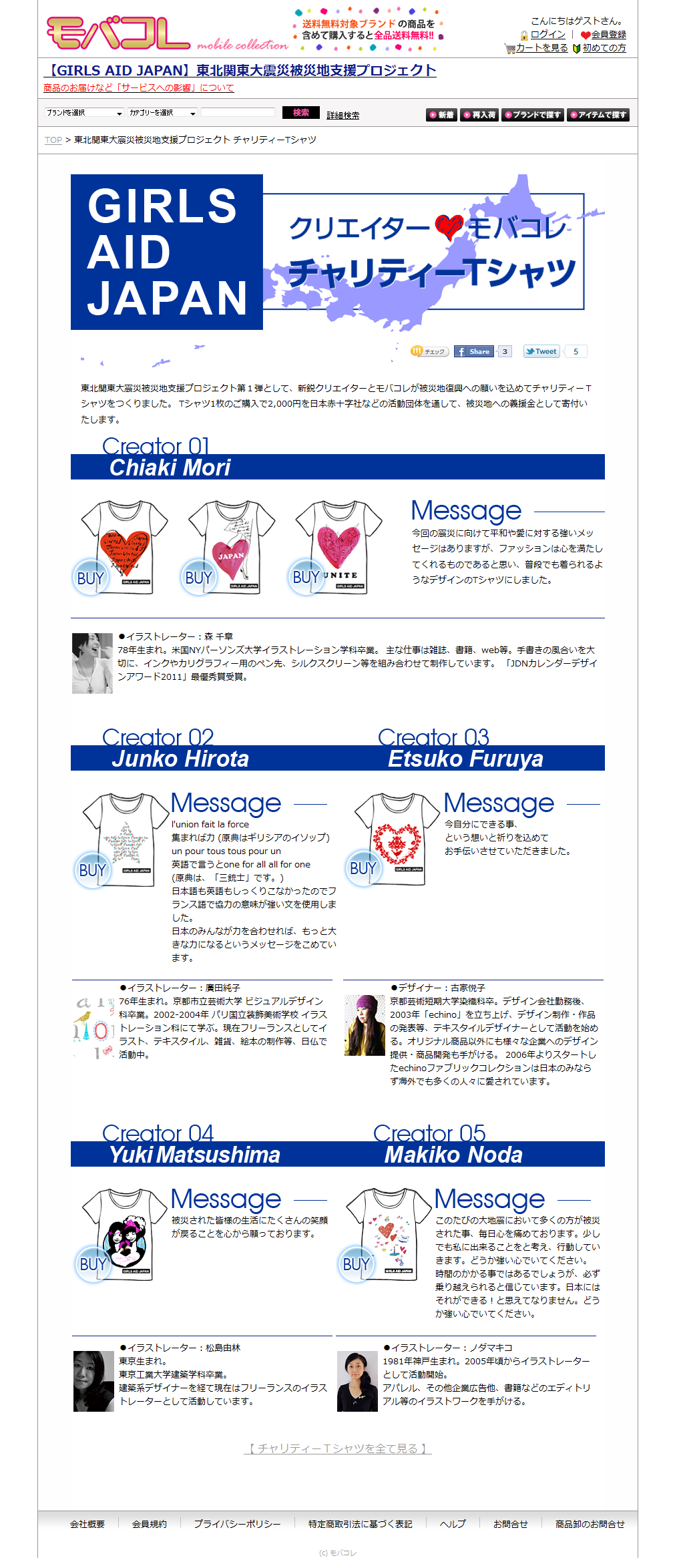 モバコレは支援プロジェクトを立ち上げ、女性クリエイターとチャリティTシャツを製造。1枚2000円で販売し、全額を寄付する。第2弾として、タレントの中川翔子さんとの共同制作したTシャツも予定している。