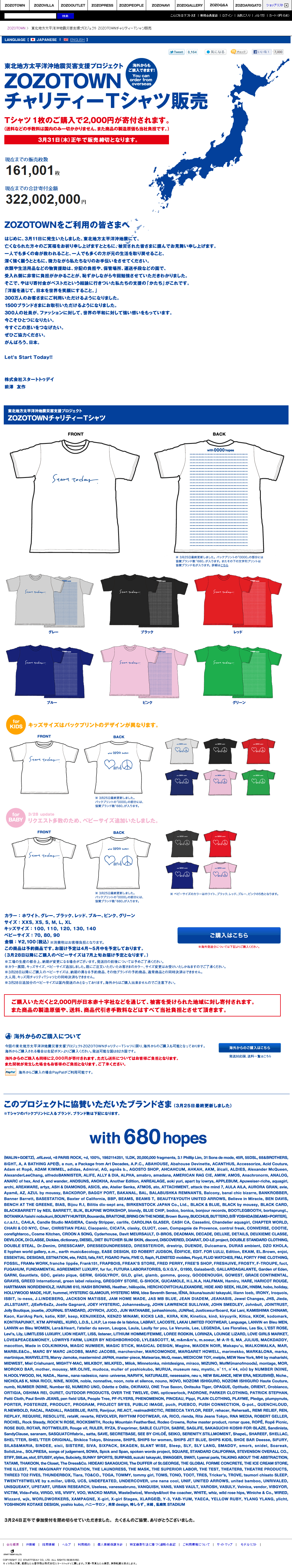 千趣会(本社大阪市)の子会社で若年女性向けファッションECサイトを運営するモバコレ(本社東京)は3月24日からチャリティTシャツの販売を開始。ワールド(本社神戸市)は3月28日に、ECサイトでチャリティTシャツの販売を始めたほか、女性向けファッションECのファッションウォーカー(本社東京)もチャリティブレスレットを販売している。3月15日から販売しているスタートトゥデイ(本社千葉市)のチャリティTシャツは3月29日時点で15万枚を超え、3億円強の売り上げになっている。
