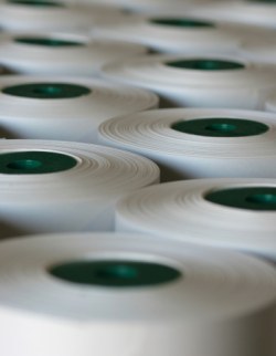 製紙業界を例に見てみます。商業用印刷用紙はすでに断裁されている枚葉(カット紙)と、トイレットペーパー状の巻き取り(ロール紙)があります。枚葉は指定されたサイズにカットされたいわゆる「紙片」で、プリンター用紙のA4、B4、B5も製法は同じです。一方、巻き取りは紙が巻かれたままの状態ではカットできないので、紙を送り出しながら指定サイズに切断しふたたび「芯」に巻き取ります。この「芯」を「紙管」と呼びます。