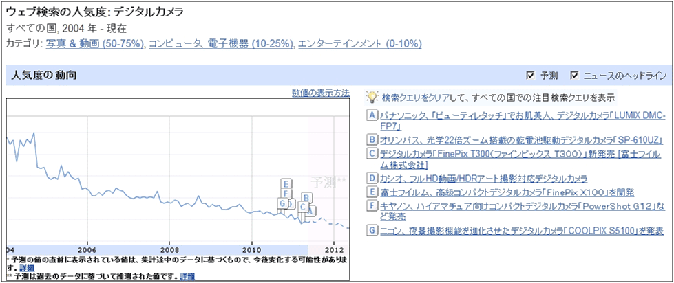 1つ目はツールとして「Google Insights for Search」を利用してみる。ここで「デジタルカメラ」と入力して[検索]ボタンを押す。その出力結果は図11の通りだ。マーケットの関心としては長期トレンドで下降気味であることがわかる。