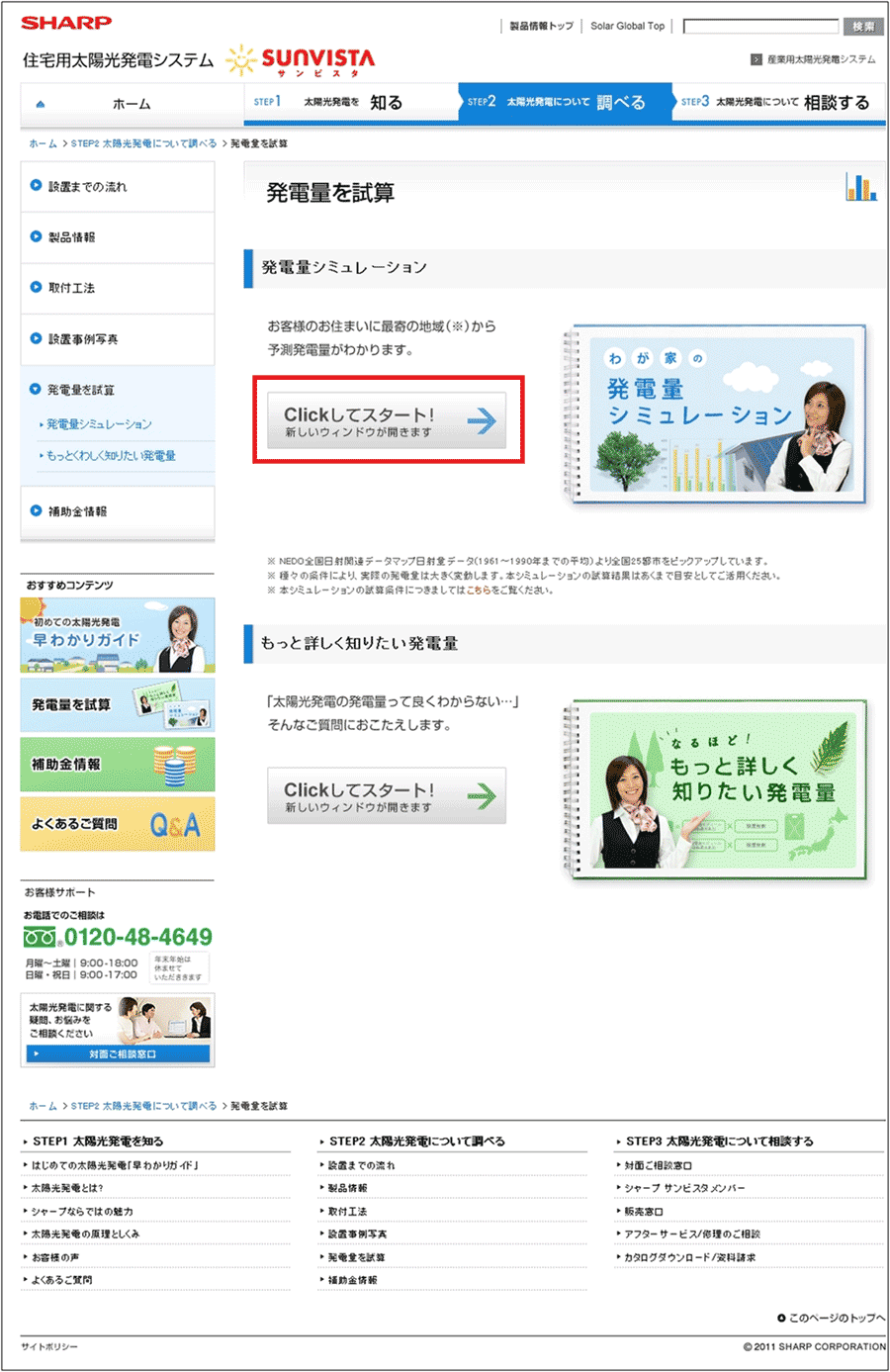 それではシャープのサイトを歩いてみよう。最初の目的である「コストを知る」のにピッタリ合致するコンテンツは、トップページから想像できるなかにはなさそうだ。とはいうものの、節約できる電気代の目安は発電量から分かりそうなので、まずは「発電量を試算」というコンテンツを見てみることにしよう。これはSTEP2「調べる」の上から3番目にリンクがある。