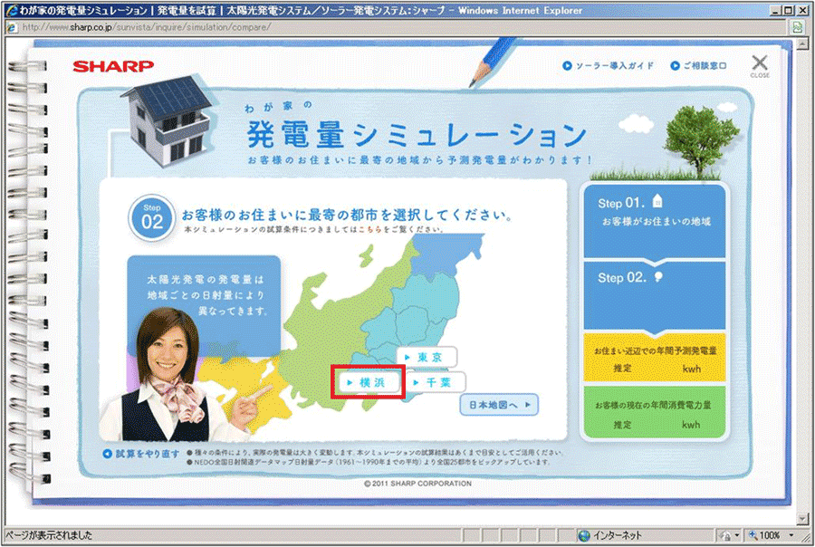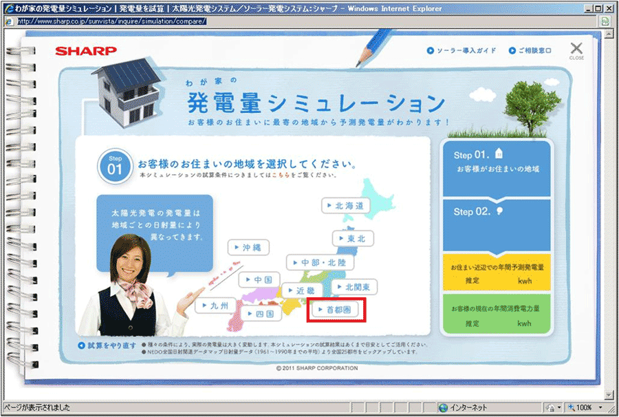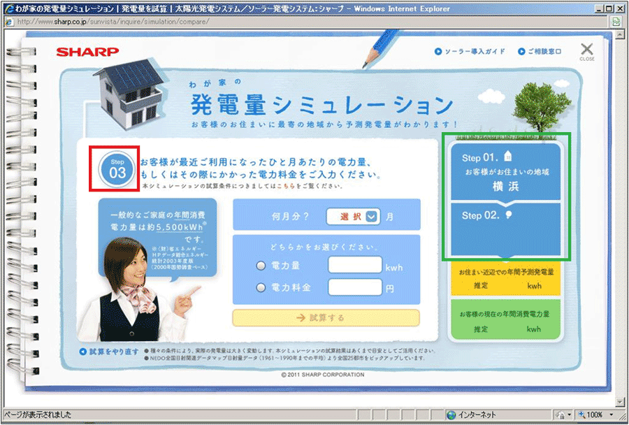 図3が「発電量を試算」のページだ。さっそく発電量シミュレーションをやってみることにしよう。「Clickしてスタート!」のボタンでも、その右側に配置してある「わが家の発電量シミュレーション」というビジュアルのどちらもクリック可能だ。クリックすると図4のページが新しいウィンドウで立ち上がるようになっている。