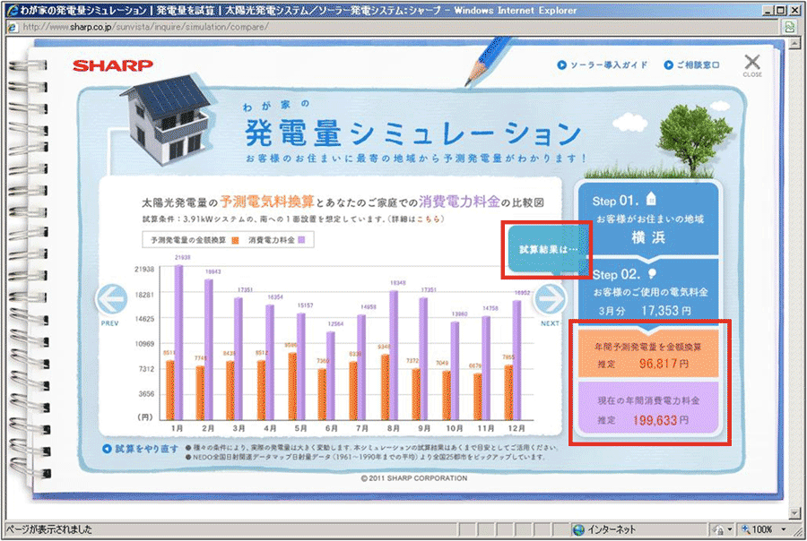 図9のように、このケースでは年間の電気代が約20万円のところ、発電によって10万円弱が浮くということが分かった。「試算結果は……」をクリックすると図10のように、その計算をして最終的に表示してくれるという流れだった。