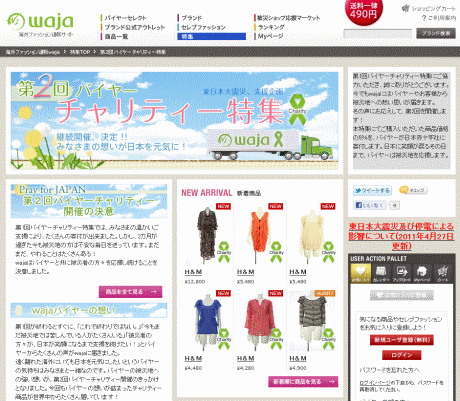 このほか震災復興プロジェクトとして、被災地にあるアパレルショップの在庫を代行販売する「被災ショップ応援マーケット」を開設。出品費用は無料。申込期限は設定していない。問い合わせはouen@waja.jpまで。
