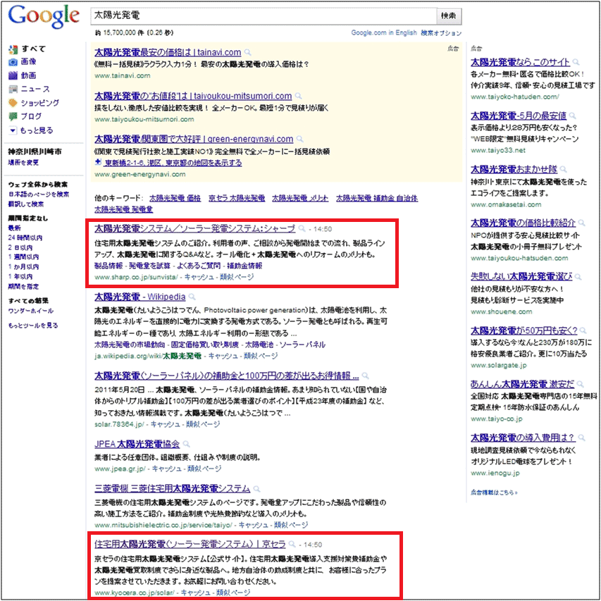 前回と重複するが、「Yahoo! JAPAN」でも「Google」でも「太陽光発電」と検索すると、京セラの「住宅用太陽光発電システム」のサイトは検索結果ページ(図2)の1ページ目の下の方に表示されている。メーカー系ではシャープ、三菱電機に次いで3番目に表示されている。これをクリックして京セラの「住宅用太陽光発電システム」のサイト(前ページの図1)へ移動することになる。