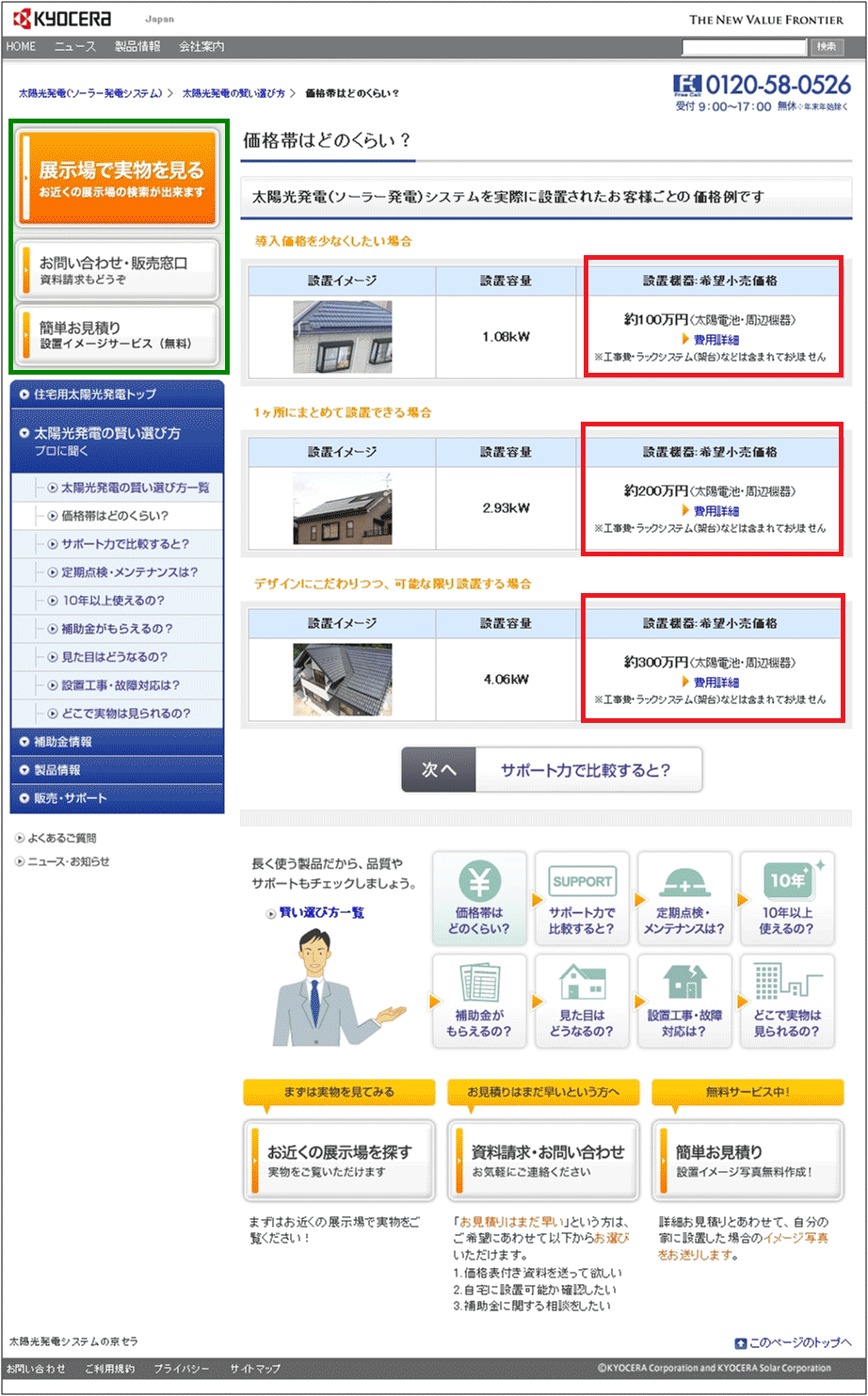 このページの左上には、「展示場で実物を見る」「お問合せ・販売窓口」「簡単お見積り」という3つのボタンが配置され(緑枠で囲んだ部分)、ユーザーが行動を起こしやすいような作りになっている。またその下にあるローカルナビゲーションがあることで、現在見ているページの位置がわかりやすくなっている。