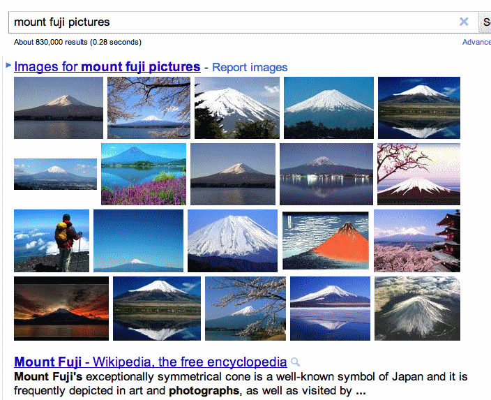 SERPが華やかに (Google Inside Search)グーグルのウェブ検索で、「photos」「pictures」「images」のような明らかに画像や写真を探していると判断できるキーワードと組み合わされた検索には、従来よりもずっと多くのサムネイル画像がユニバーサル検索として表示されるようになった。米国の公式ブログでの発表だ。