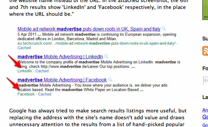 ブランド優遇か (Google Operating System)通常、検索結果ではウェブページのURLが表示される。しかしグーグルは、URLの代わりにそのウェブページのサイト名を表示するテストを行っているようだ。