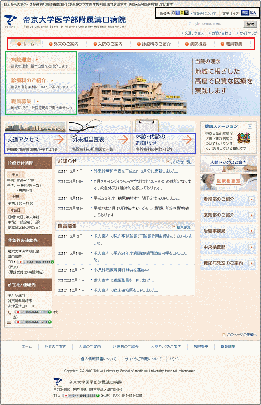 グローバルナビゲーション(図3の赤枠で囲んだ部分)では、「外来のご案内」「入院のご案内」「診療科のご紹介」「病院概要」「職員募集」など、主要な訪問目的と思われるコンテンツへのリンクを用意している。