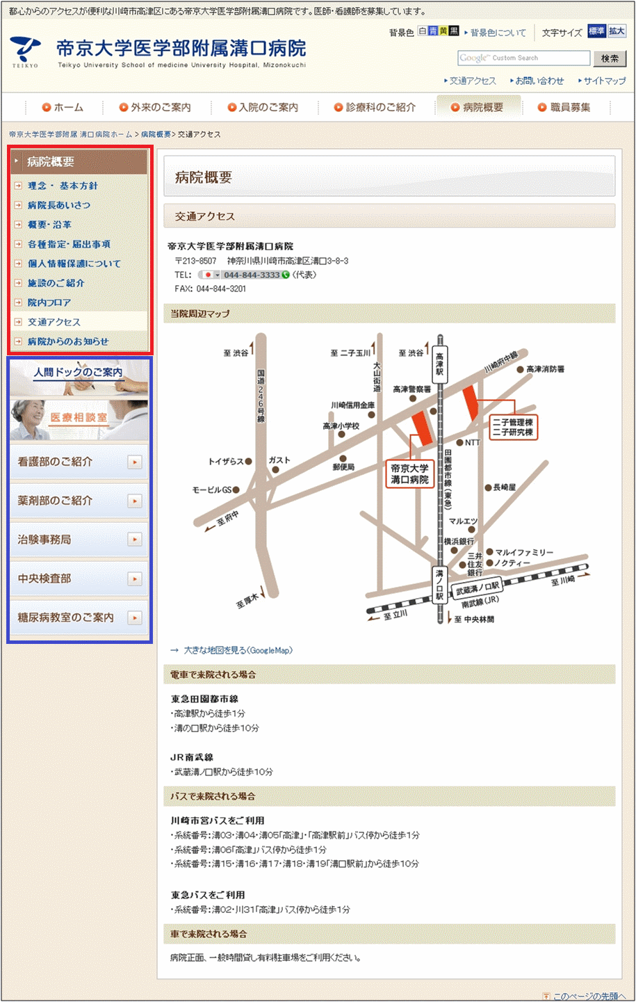 住所・電話番号に続いて、わかりやすい地図があり、その下にはアクセス方法別の所要時間などが丁寧に書いてある。また第2階層にあるページは、左側にローカルナビゲーション(赤枠で囲んだ部分)と固定リンク(青枠で囲んだ部分)がある構造で統一感がある。