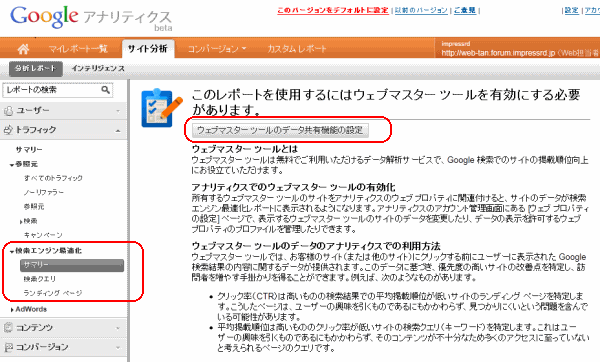 当選のメールが届いたら、Googleアナリティクスにログインして、新しいインターフェイスでサイトのレポートを表示すると、[トラフィック]の下に[検索エンジン最適化]というメニューができているはずです。このレポートを表示使用とすると、ウェブマスターツールとのデータ共有機能を促されるので、共有機能の設定のボタンをクリックします。