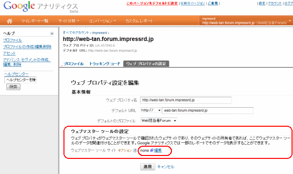 Googleアナリティクスのプロファイルに戻り、ウェブマスターツールで選んだサイトが設定されているのを確認して[適用]ボタンをクリックします。