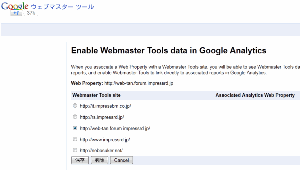 ウェブマスターツールの画面が表示されるので、ウェブマスターツールに登録済みのサイトから、Googleアナリティクスのプロファイルに対応するサイトを選んで[保存]をクリックします(確認が表示されますので[OK]をクリック)。