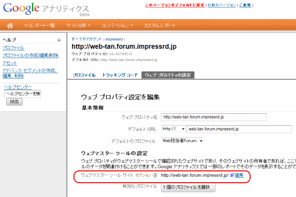 Googleアナリティクスのプロファイルの設定画面が表示されます。「ウェブマスター ツール サイト」という項目の[編集]をクリックします。