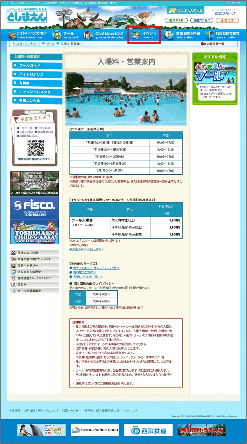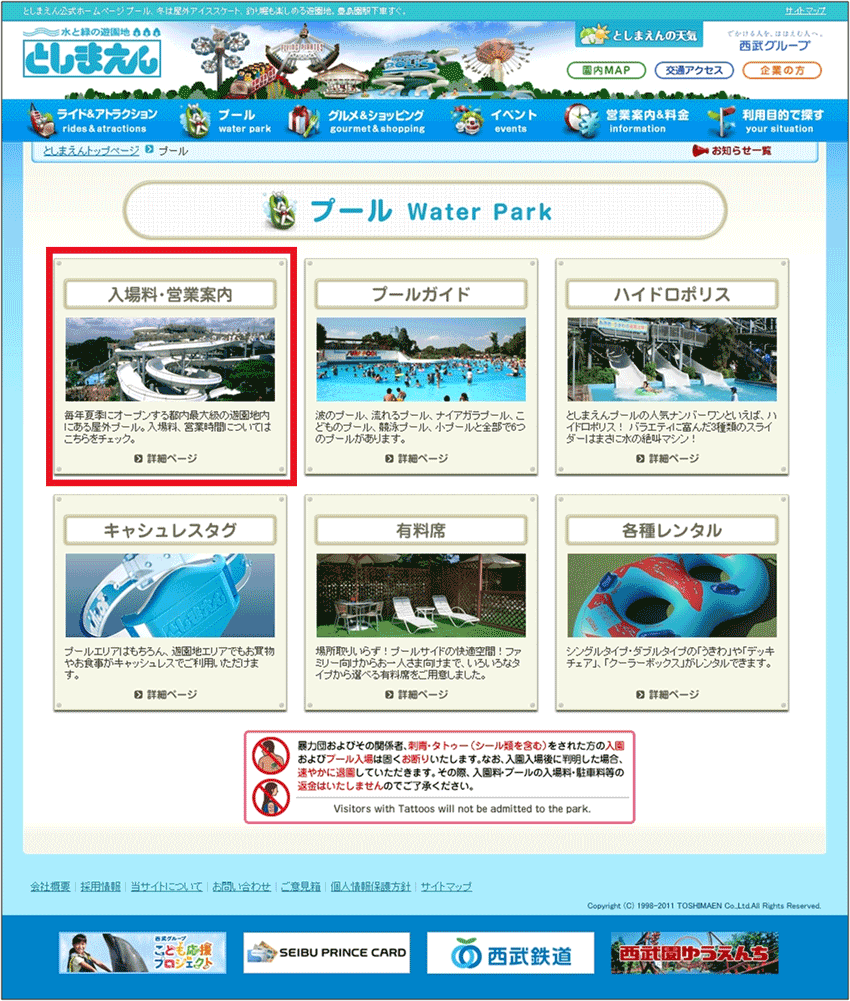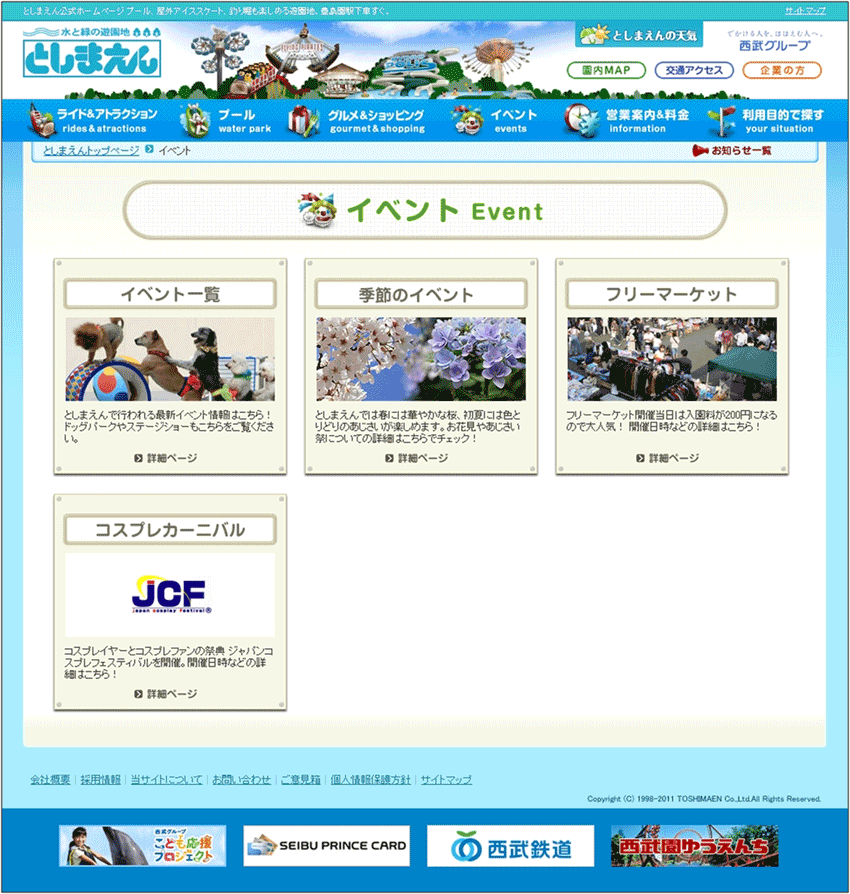 4つの項目がある。それぞれが1つのイベントで、全体でも多くのイベントが開催されているわけではなさそうなので、ここはシンプルに1ページにまとめてしまってもよいと感じたが、他の第2階層のページの作りから考えると、ナビゲーションの仕方はこのままで統一しておいた方がよいだろう。ただ、「よみうりランド」のトップページのように、現在開催しているイベントや、あるいはプールに行く日に開催するイベントが一覧でわかるようになっている方が調べる人の立場に立っていると言えよう。