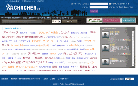フェイス(本社京都府、平澤創社長)は6月24日、インターネットユーザー同士が検索サイト上で交流するサービス「CHACHER(チャチャー)」を開始した。ID登録したユーザーが「チャチャー」でキーワード検索すると、同じキーワードを検索したユーザーが表示され、ユーザー同士でメッセージのやり取りができる。ユーザー登録は無料。
