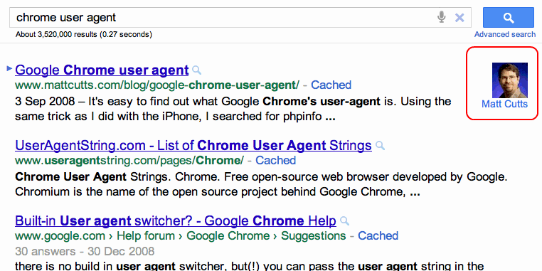 あなたの名前と顔が検索結果に出るかも (Google Inside Search)コンテンツとその作成者を結びつける「rel="author"」タグと「rel="me"」タグをグーグルが導入したことを少し前に取り上げた。グーグルはこの仕組みを応用し、グーグルプロファイルに登録されている情報を基に、コンテンツ作成者の名前と写真を検索結果に表示するパイロットテストを始めた。現在はGoogle.comだけでの適用となる。