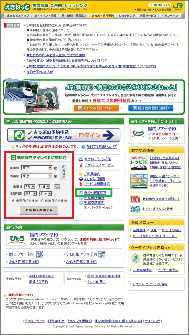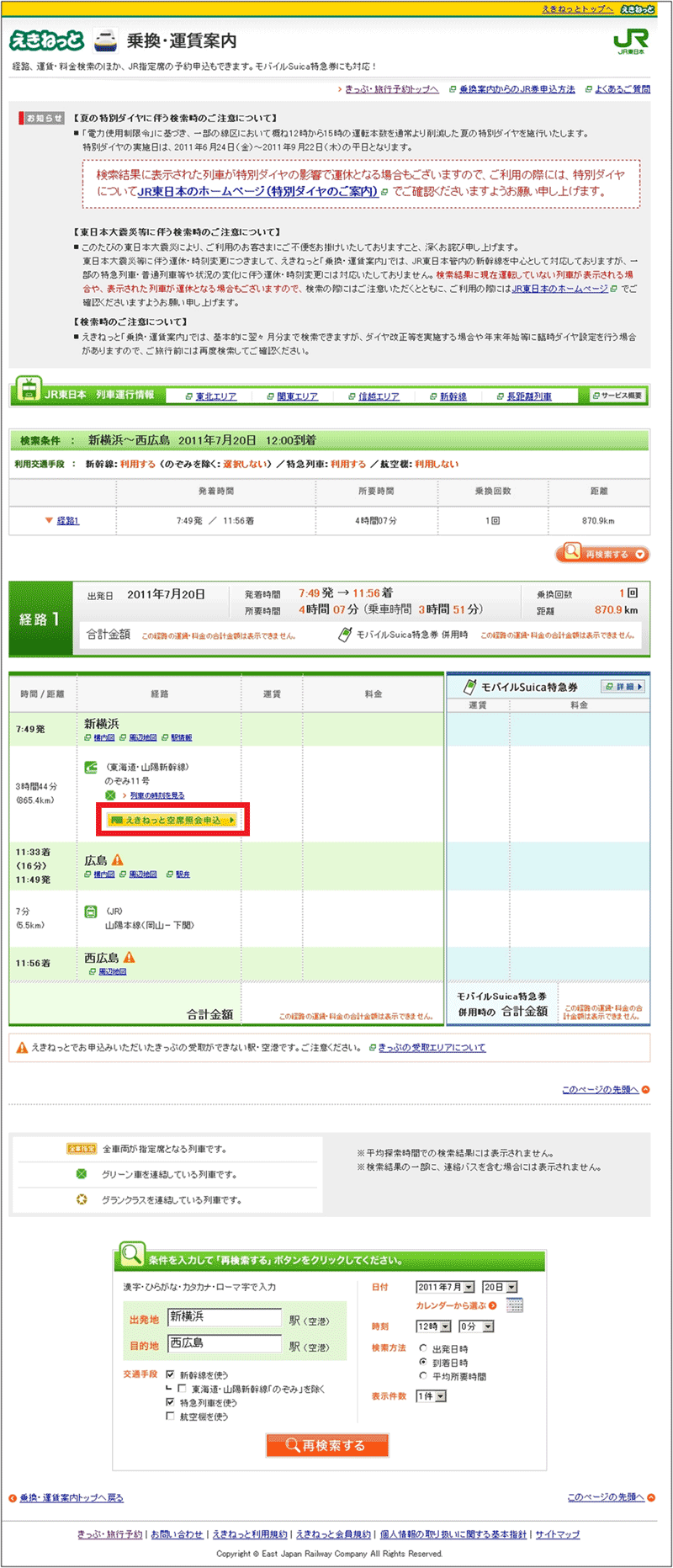 それにしても、この[えきねっと空席照会申込]のボタン。黄色の背景色に緑色の文字というデザインだ。いったんその存在に気がついてしまえば、「ああこれか」と思うのだが、最初はこれがボタンだということに気づかなかった。そのため、「乗換・運賃案内」の検索結果ページが表示されたあと、次にどういうアクションをとったらよいのか、しばらくわからなかった。