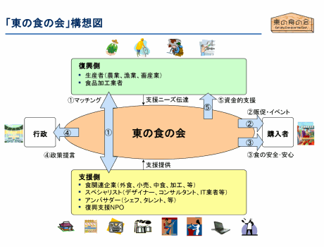 東の食の会が提供するプラットフォーム上で、生産者と商品を求めている外食事業者や販売事業者をマッチングする。支援企業は年間10万円の会費でデータベースを利用でき、生産者は無料で商品が掲載できる。