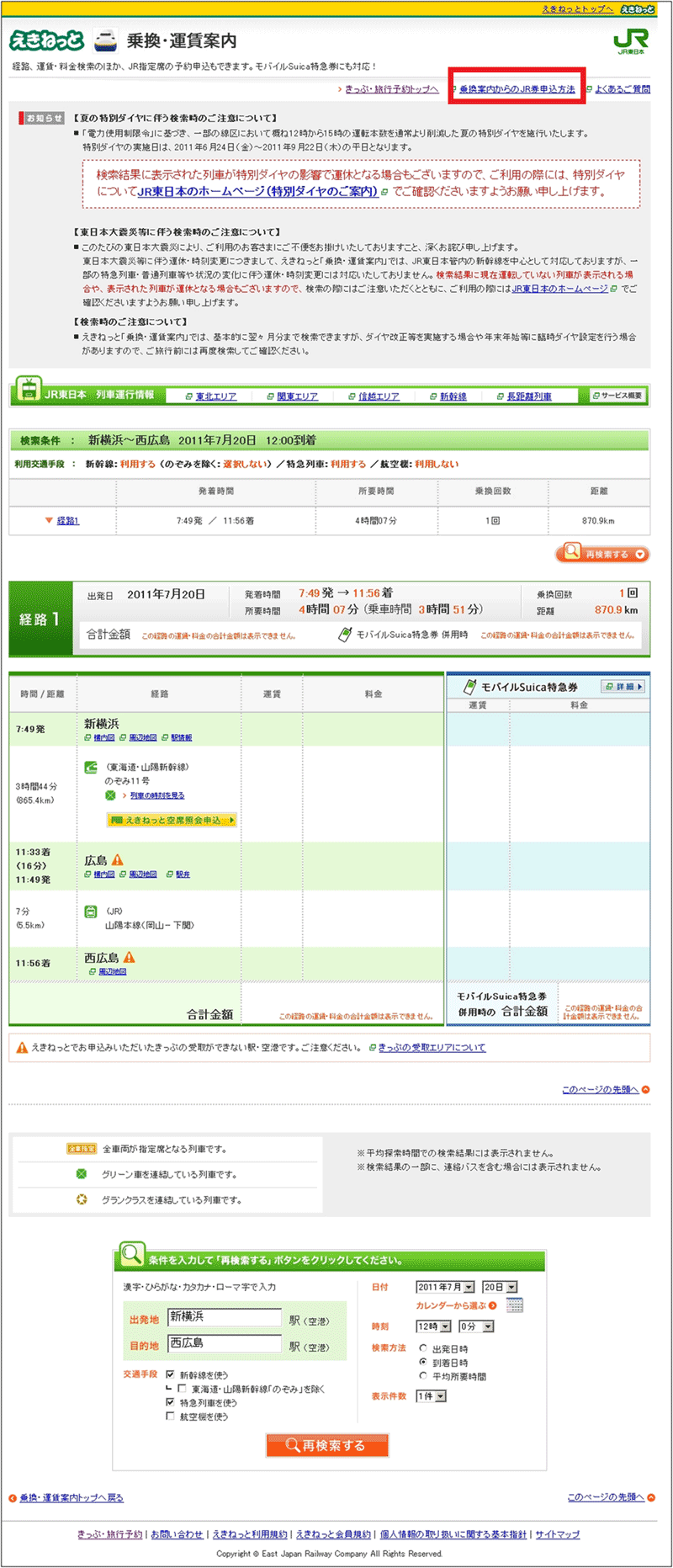 前回の2ページ目で見た「乗換・運賃案内の検索結果ページ」で、右上に「乗換案内からのJR券申込方法」というリンクがある(下の図1の赤枠で囲んだ部分)ので、これをクリックしてみることにした。