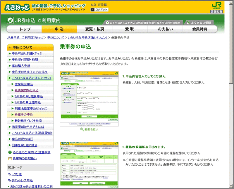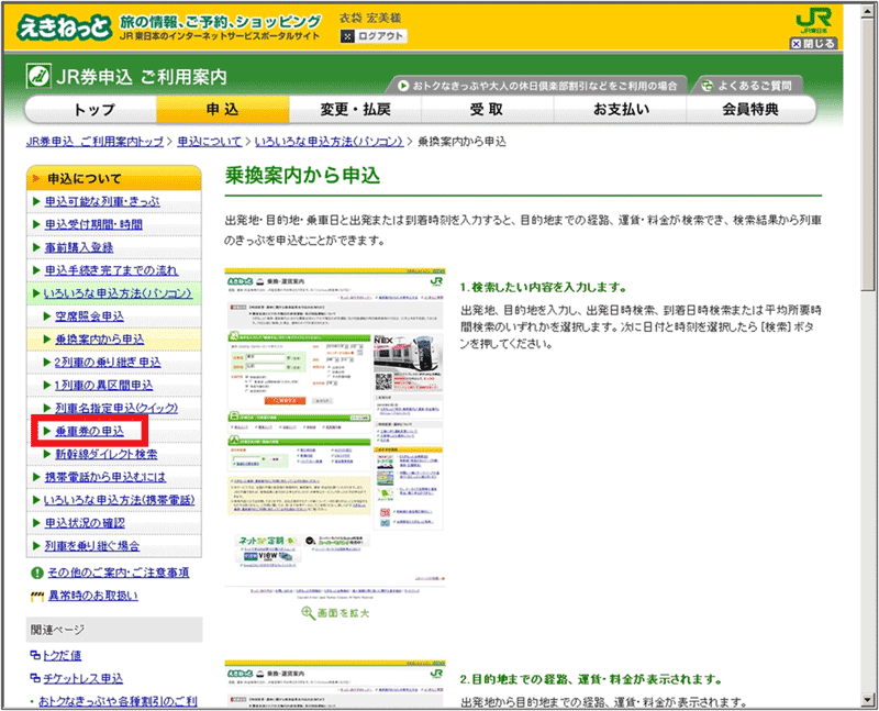 左側のローカルナビゲーションの真ん中あたりに、「乗車券の申込」というリンクがある(図2の赤枠で囲んだ部分)ので、これをクリックしてみたのが、下の図3だ。