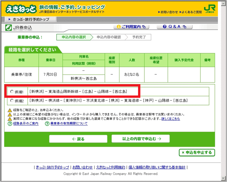 表示された2つの経路から、新幹線を使う候補1をチェックして、「以上の内容で申込む→」ボタンを押して次へ進む。それが下の図7だ。