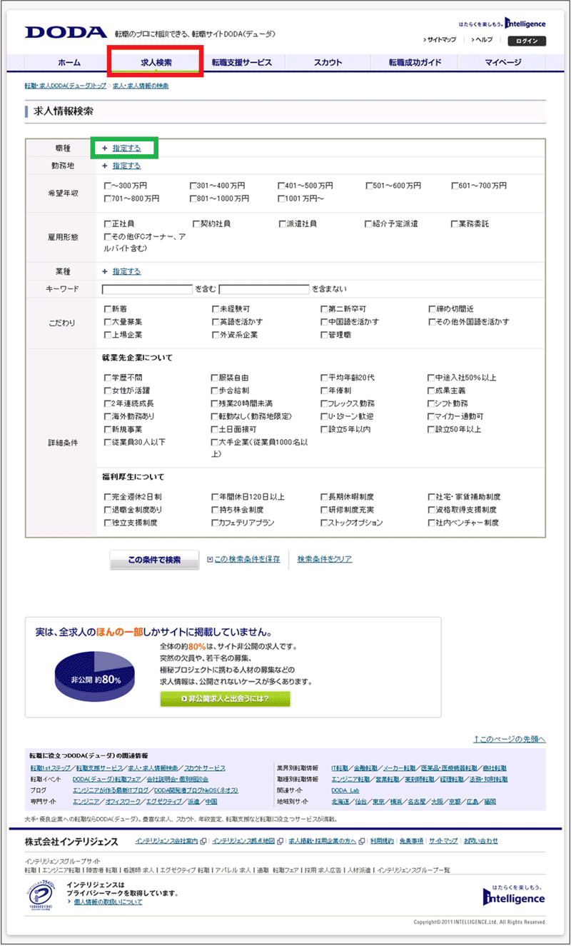 グローバルナビゲーションの「求人検索」をクリックしたあとのページが、下の図1だ。どうも先週の前半記事執筆時点でのインターフェイスと違うようで、選択項目表示が大幅に増えているようだ。