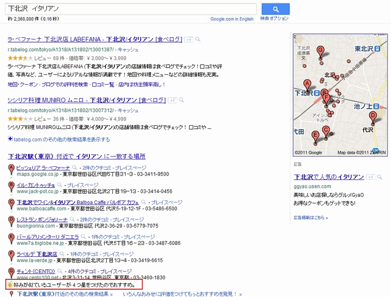 グーグルのプレイス検索(地図検索)は、グーグルアカウントにログインした状態でレストランや喫茶店など飲食店を探した場合に自分と似たような好みを持つユーザーが気に入っているお店をおすすめする機能を追加した。日本のグーグルでも確認できた(筆者は確認できなかったのだが、グーグル+でtaku matsuoさんにご提供いただいた)。