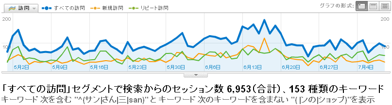 Google Analyticsならば、前出のキーワードの画面で絞り込みフィルタを使ってナビゲーショナルクエリに使われるキーワードに絞り込み、アドバンスセグメントで「新規訪問」「リピート訪問」を見るといいだろう。