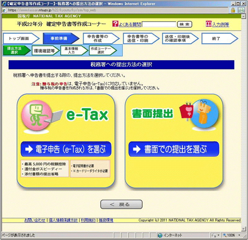 さて、このページでは、e-Taxにするか、書面提出にするかを選択できる。このe-Taxに関して、ひとこと言っておきたい。e-Taxとは、税金に関する申告や納税をオンラインで行える仕組みで、これを使えば、税務署に足を運ばなくても、オンラインで確定申告ができる。しかし、e-Taxで申告をするには、年に1度しかない確定申告であるにもかかわらず、ユーザーは自己負担で電子証明書とICカードリーダライタを用意しなくてはならない。しかも、その特典としては、最高5, 000円の控除が受けられるだけだ。国税庁は個人事業主への普及を進めようと躍起になっているようだが、これでe-Taxが普及すると思っているのだろうか。