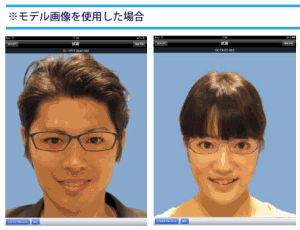 顔写真をアプリ内に取り込むと、アプリ機能が顔の大きさと眼鏡フレームの縮尺を解析、眼の中心位置と黒目の大きさなどを計算する。顔の大きさなどに最適な眼鏡フレームの縮尺を計算し、実際のサイズで眼鏡を掛けたように写真を合成する。