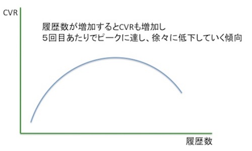 いくつかのクライアントのデータを分析してわかったのだが、クライアントや分析時期によって差はあるが、だいたい履歴数5回ぐらいまではCVRが徐々に上昇していき、そこをピークとして、その後はCVRが低減していく現象がある。つまり、1回、2回、3回と履歴数が増えるにつれて顧客育成が起こり、消費者がコンバージョンしやすい状態に変わっている。態度変容が起こっているといってもよいだろう。そして、5回前後を境にして効果が飽和し、CVRが下がり始めると考えられる。このようなCVRの変化は、コンバージョンのしやすさが変わっているからだと判断できる。1回よりも2回、2回よりも3回の方がコンバージョンしやすくなっているからこそ、CVRが上がっていくのだ。
