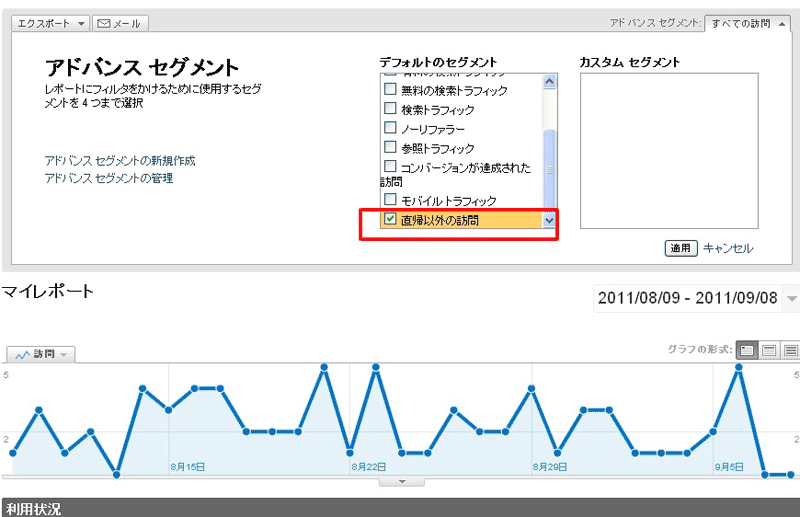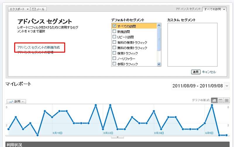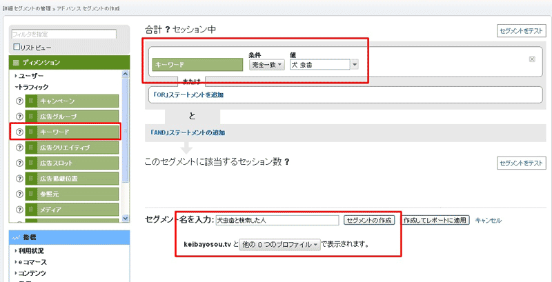 アドバンスセグメントを使って、ステップ1で考えた特定キーワードを検索したユーザーだけに絞り込んでみましょう。