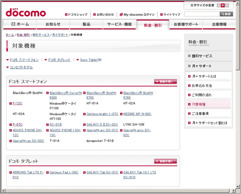 図解の左には「スマートフォンなど」と書いてある(図19の青枠で囲んだ部分)が、その下の「※1」を見ると「タブレット端末が対象となる」と書いてある(図19の赤枠で囲んだ部分)。よくわからないので、結局その下の詳細情報の「対象機種」(図19の緑枠で囲んだ部分)を見るしかないとあきらめる。これをクリックして対象機種を確認したのが「対象機種」のページ(図20)で、月々サポートの対象にはスマートフォンが含まれていることがわかった。